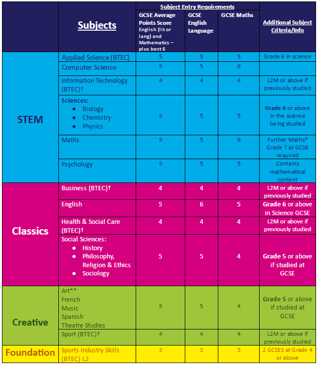 † Entry criteria must have been met for the A Level subject over and above BTEC (for single A level BTEC equivalent).